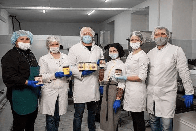 Вся производственная команда работает в небольшом помещении. У каждого есть халат, шапочка и перчатки.