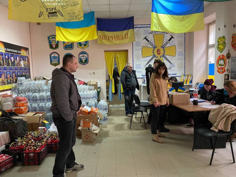 У Чернівцях функціонує “Волонтерський штаб захисту України”. На цю локацію доставляють гуманітарну допомогу зі всього світу. Її у штабі фасують та доставляють у населені пункти в небезпечних районах. Загалом у цьому місті працює близько 200 волонтерів. Більшість з них є переселенцями, які знають як потрібна допомога на території бойових дій.